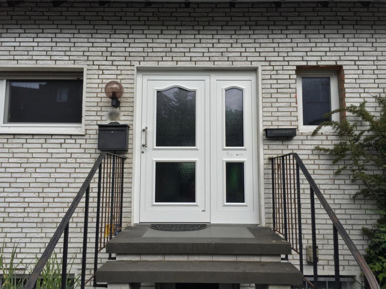 Die Graute Therm 80 Haustür, Motiv 5046, ist mit einem passenden Motivseitenteil ausgestattet. Die Klingel und das Sprechfach sind im Kämpfer des Seitenteils mit einem dahinter liegenden Installationskasten integriert. Die Ausführung stammt aus dem Jahr 2016.