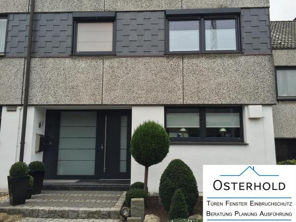 Die Biffar Haustür 565, Motiv AXN5, ist mit einem Seitenteil mit Motivverglasung ausgestattet. Ergänzt wird die Konstruktion durch PaXabsolut Secura Kunststofffenster, die außen anthrazit foliert mit Sandstruktur sind, teilweise mit Vorbaurollläden.