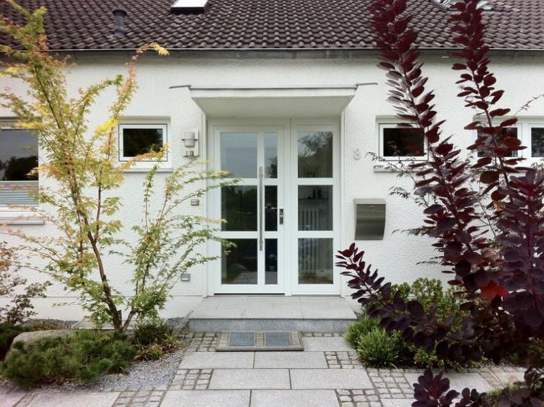 Die Biffar Aluminiumhaustür, Motiv S33G, ist mit einem Seitenteil ausgestattet und in RAL 9016 weiß gehalten. Der Außenbeschlag besteht aus einer Edelstahl-Griffstange und einer Edelstahl-Rosette. Die Verglasung ist in Klarglas ausgeführt.